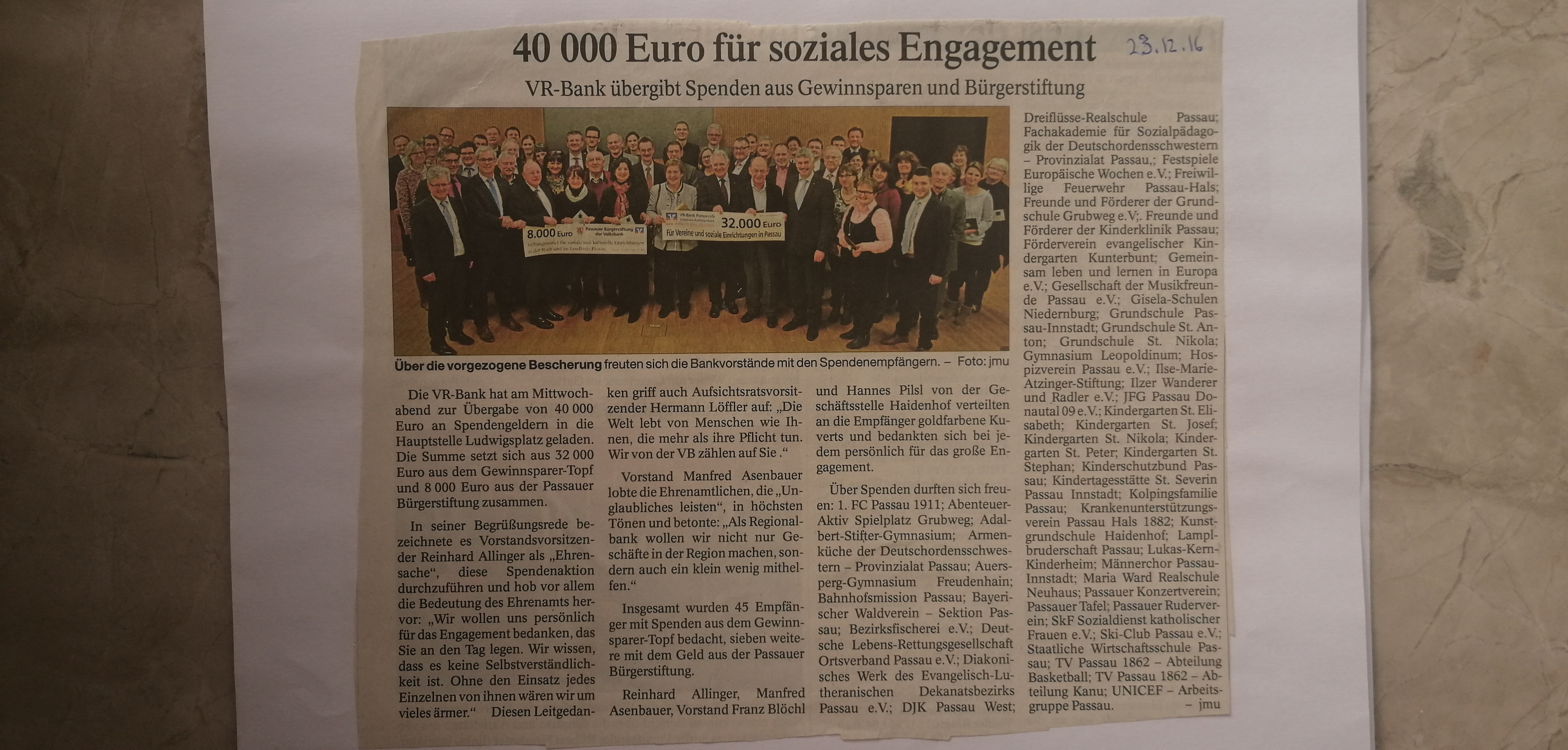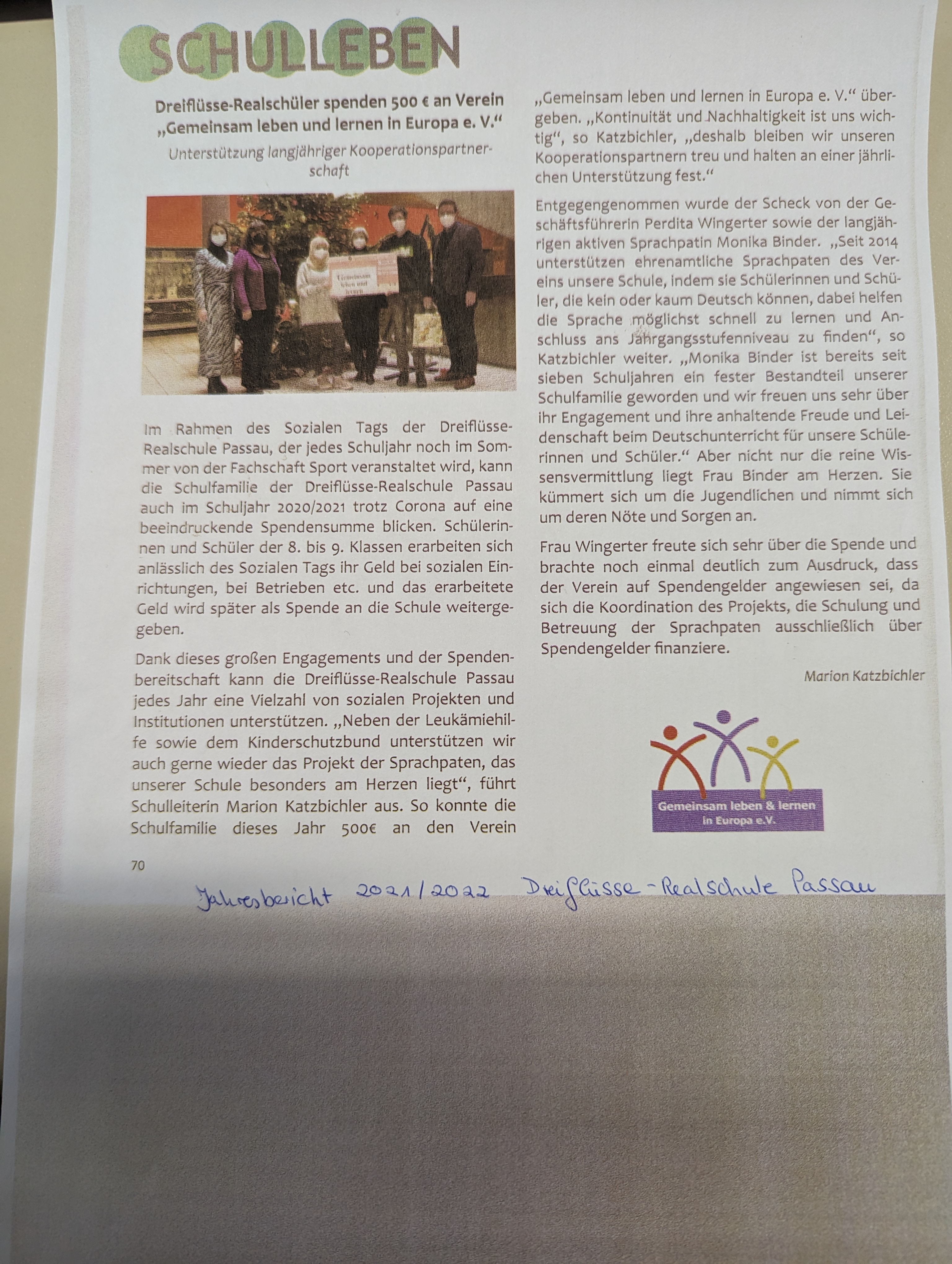 Schulfamilie spendet 1500 € für den Verein "Gemeinsam leben und lernen in Europa e. V.", Jahresbericht Dreiflüsse-Realschule Passau, Juli 2025 hier